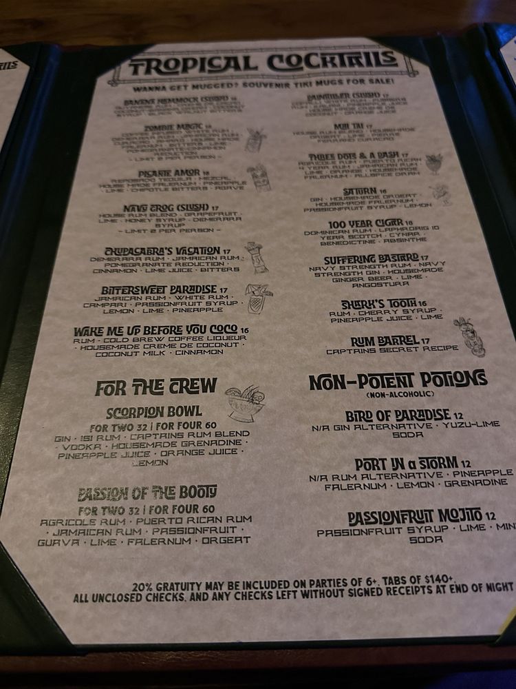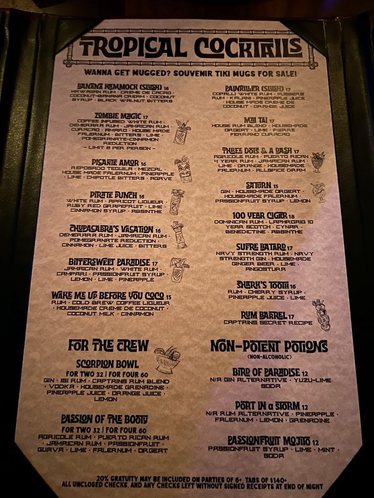 Broken Compass Tiki, located in Burbank, CA, is a trendy New American restaurant offering a unique dining experience. With a focus on inclusivity and sustainability, the restaurant provides a variety of options for diverse dietary needs, including pescatarian and vegan choices. The menu features a range of delicious dishes, from Happy Hour specials like Copalli Daiquiri and Fish Tots to kid-friendly options such as Chicken Tenders and Grilled Cheese. The restaurant also offers a selection of merchandise, including the Boo! Trick Or Treater Tiki Mug and Broken Compass Aloha Shirt, adding to the overall laid-back and fun atmosphere. With amenities like outdoor seating, a full bar, and gender-neutral restrooms, Broken Compass Tiki is the perfect spot for a night out or casual gathering. Don't miss out on this hidden gem in Burbank!